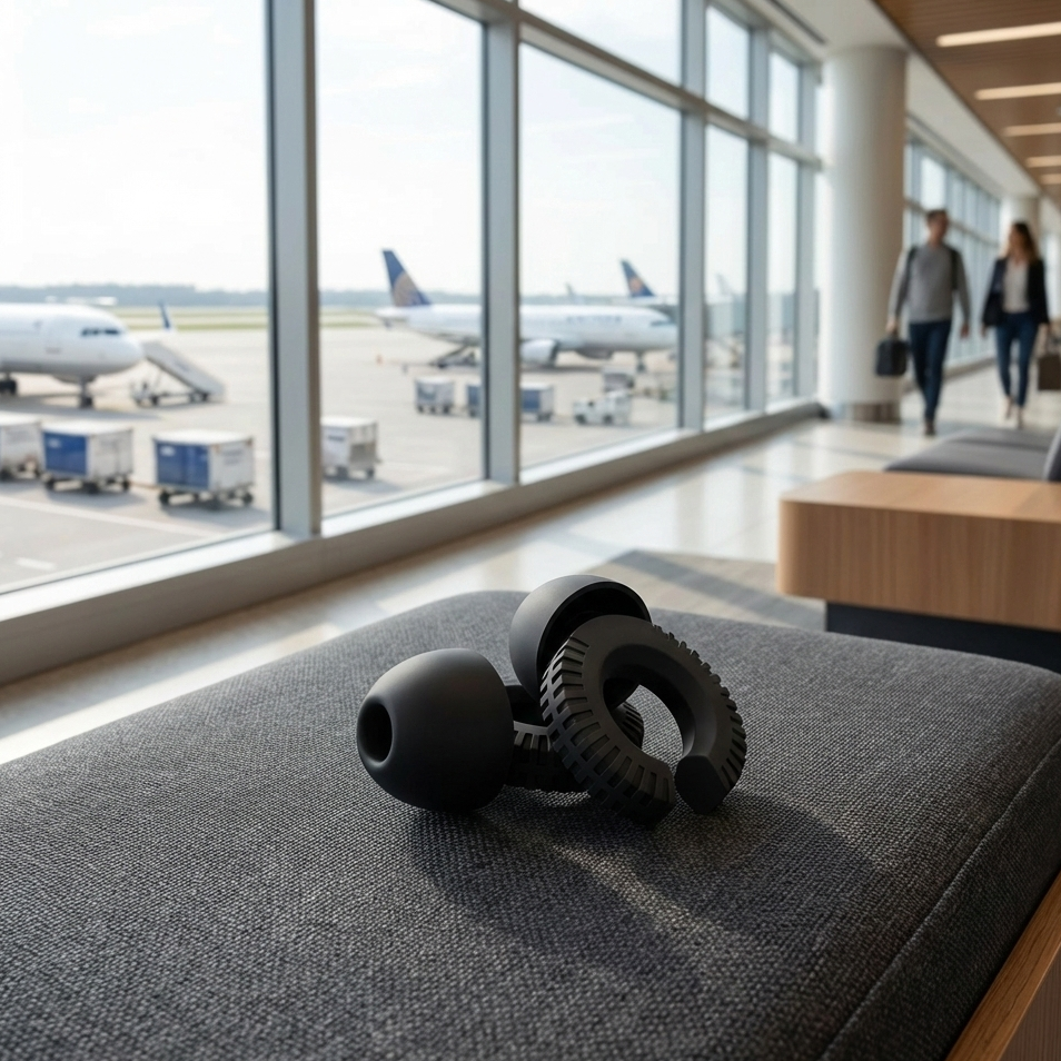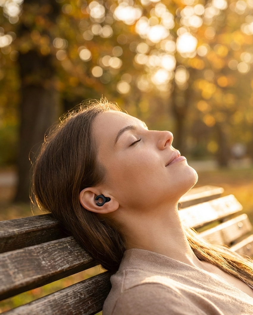 Adaptive earplugs crafted to bring softness to loud nights, busy days and constant movement — helping you sleep deeper, think clearer and travel in calm.